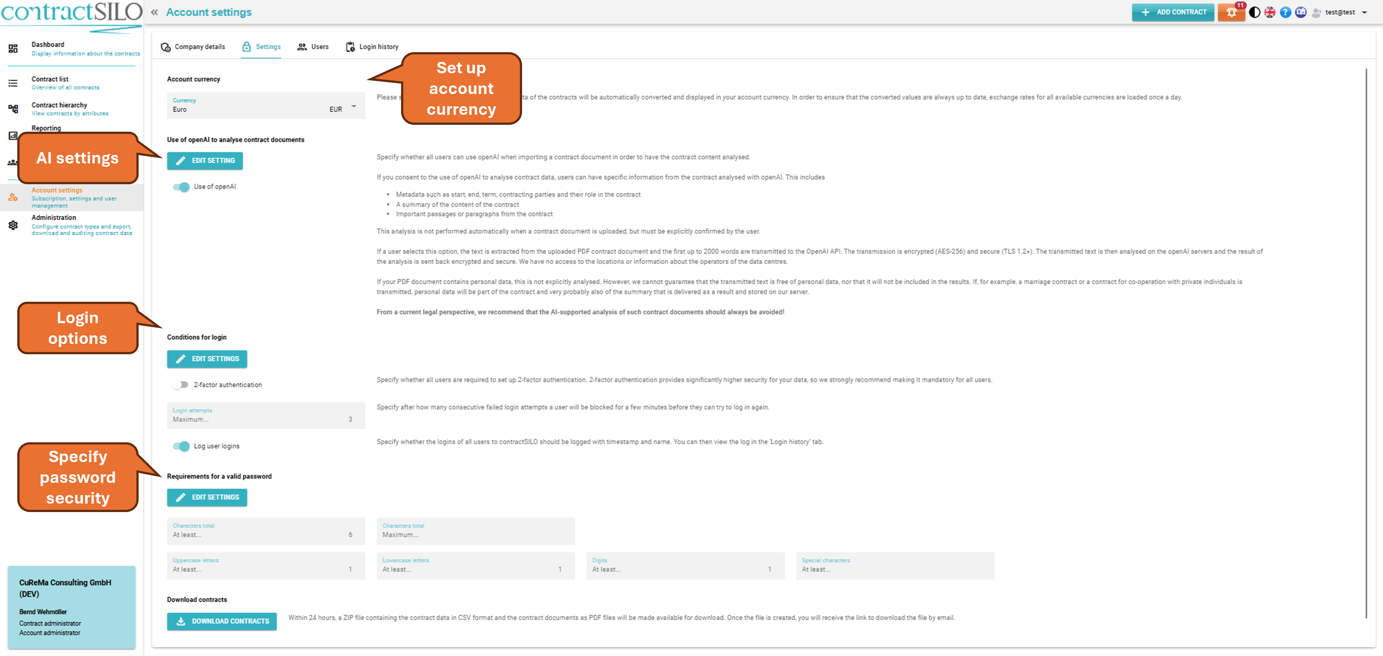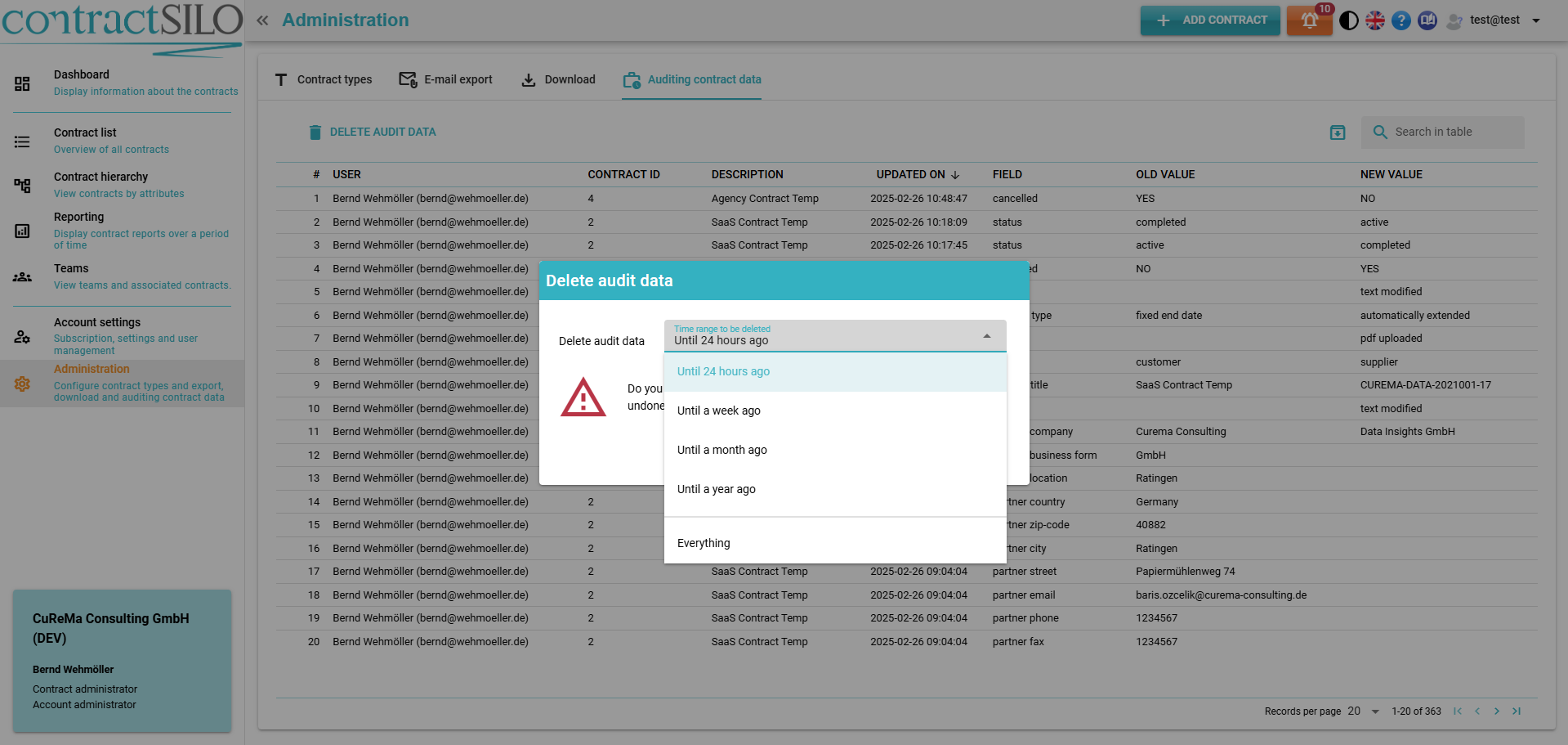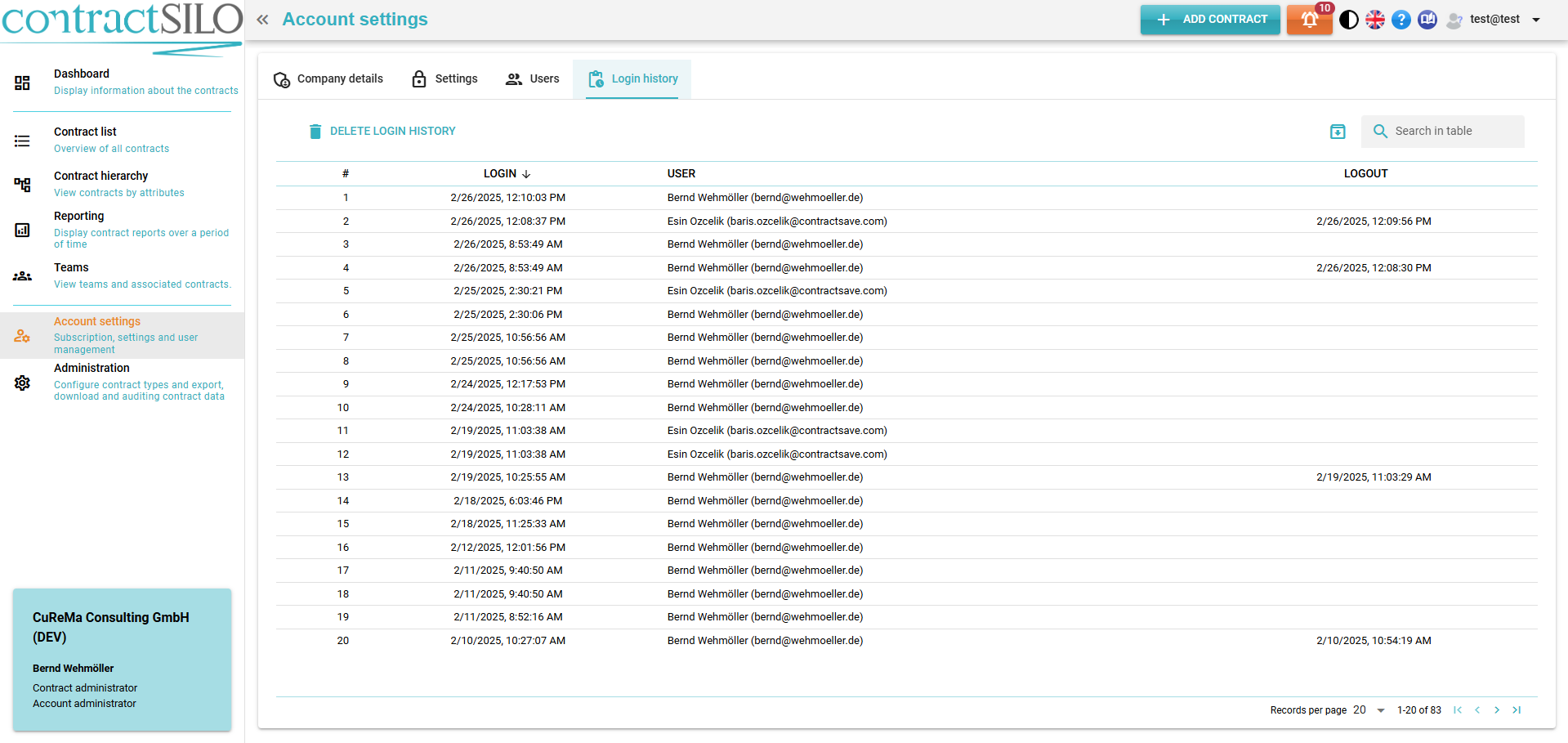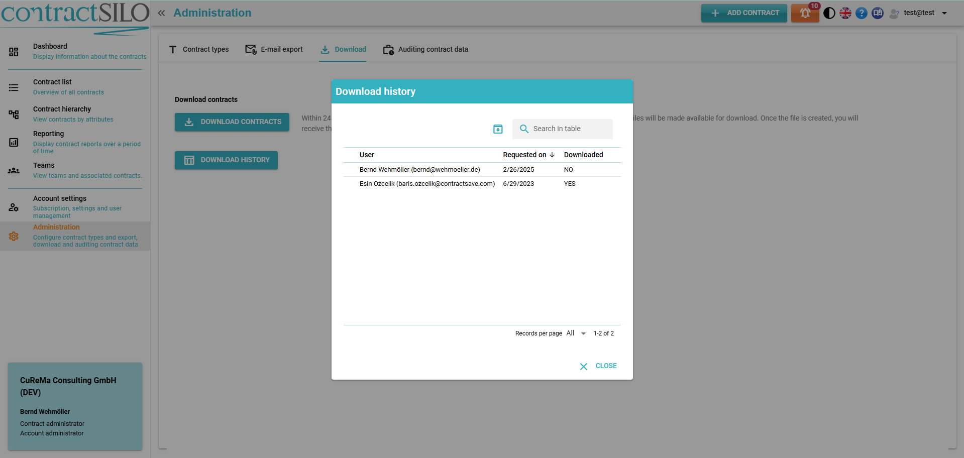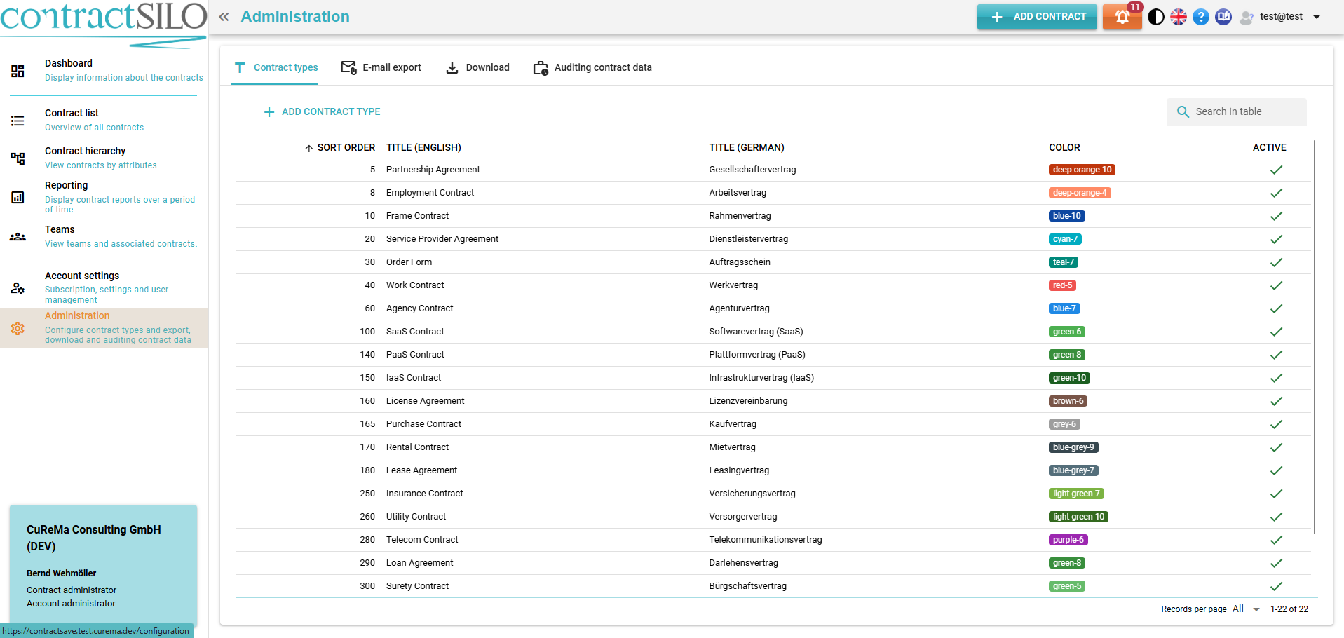 Contract administrators are users assigned to the administrator team. They can view and edit all contracts and manage contract teams and contract types. Please also read the chapter Managing Contracts in a Team.