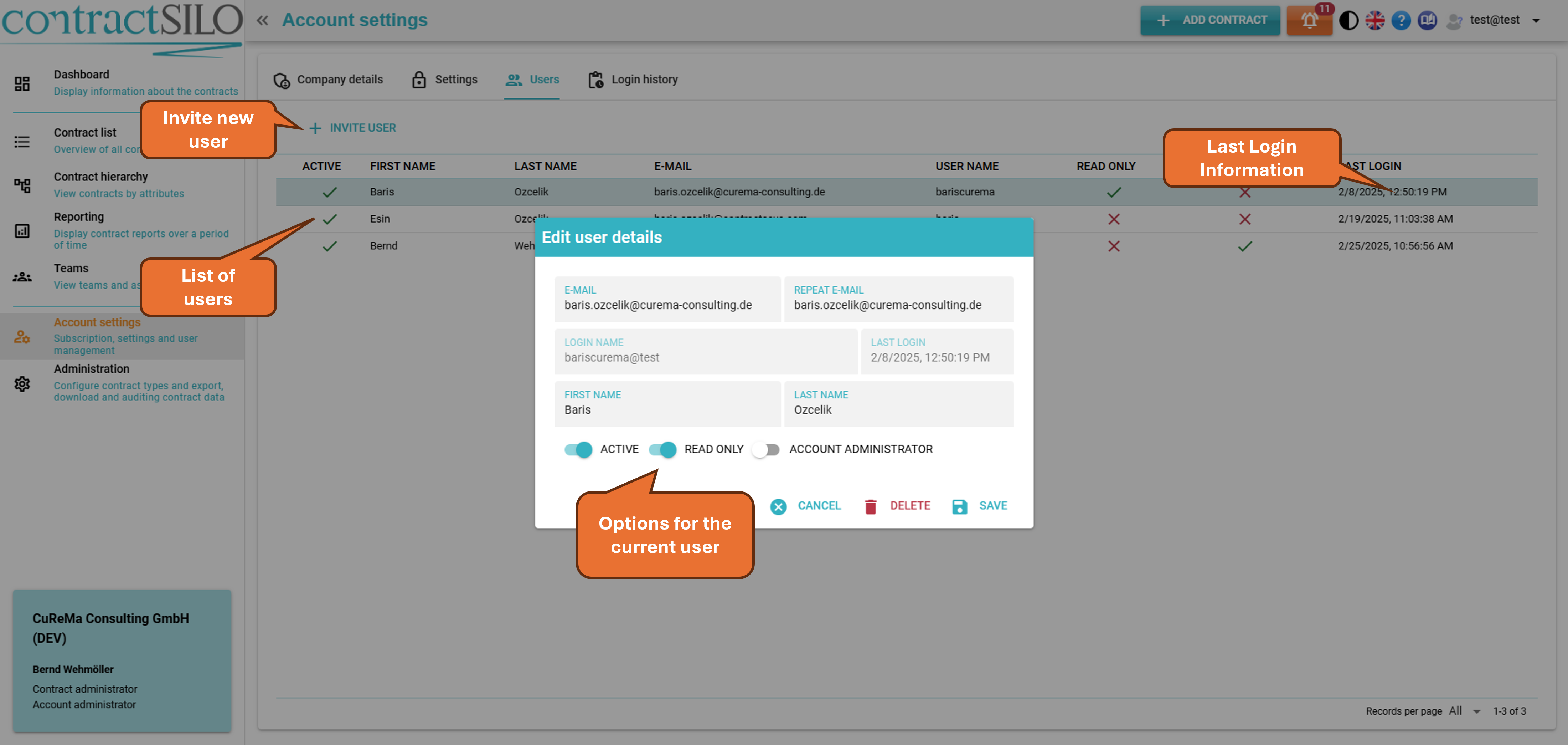Click the "Invite User" button to invite a new user. You need to enter an email address and a username. The new user will then be invited to contractSILO via email.