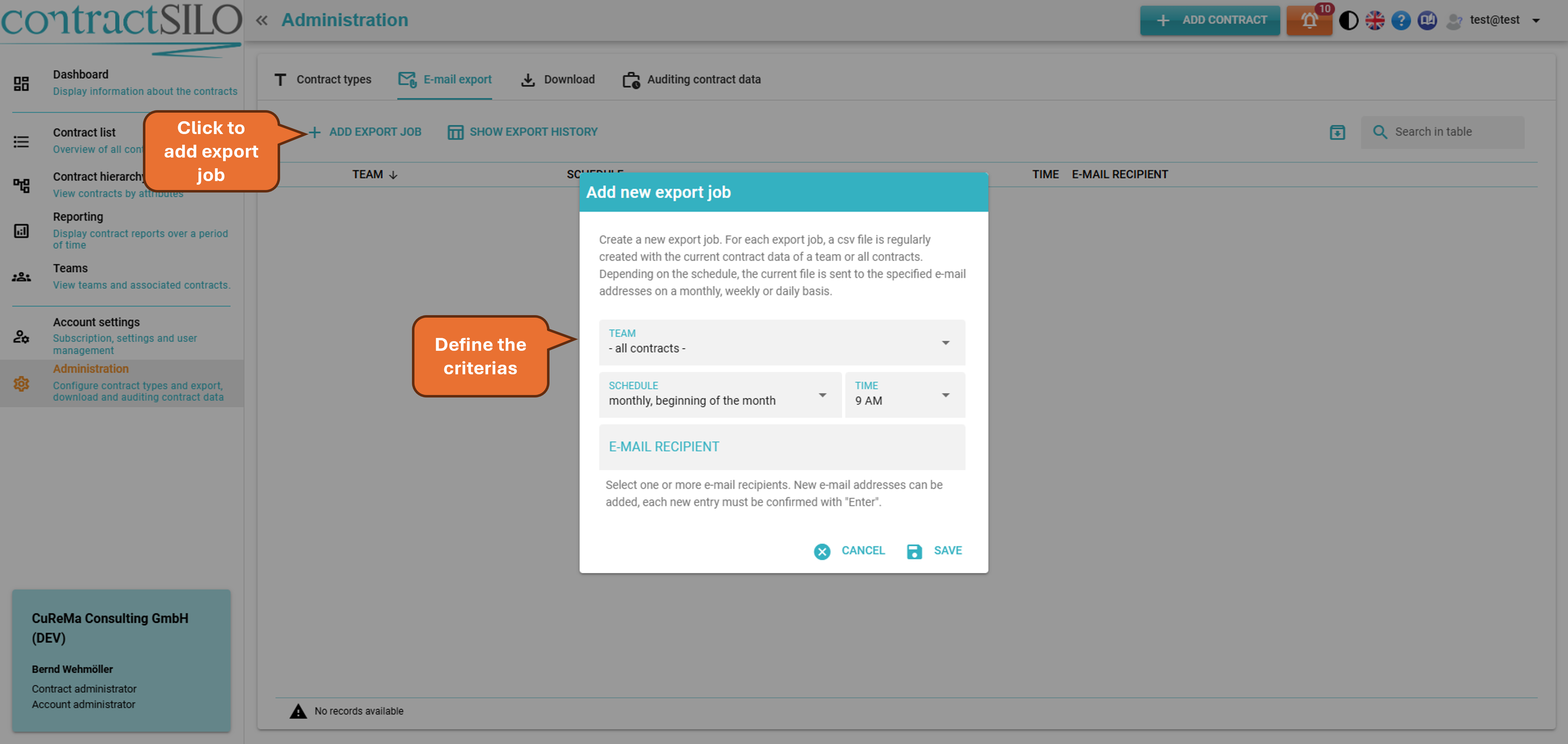 In the ‘Email export’ tab, you can set export orders that enable contractSILO to regularly send a csv file containing up-to-date contract data to the relevant recipients. (Professional version only)