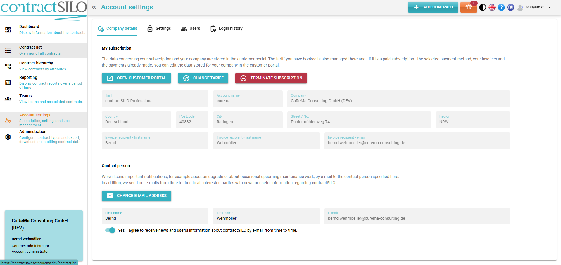 The designated contact person will be contacted by us, for example, when we release a new version of contractSILO or in the event of a technical outage. If you have checked the checkbox below, you will also receive occasional information about contractSILO and our other products.