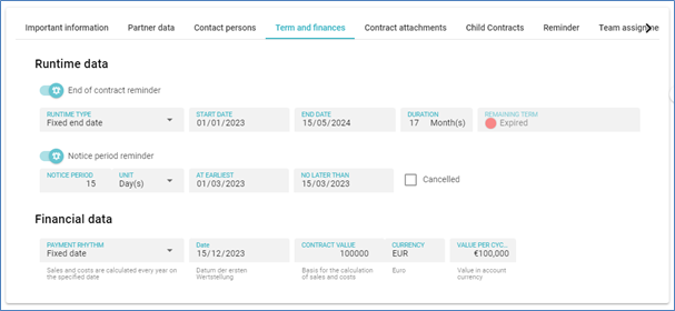 In this section, data regarding the duration and finances of the contract are recorded.