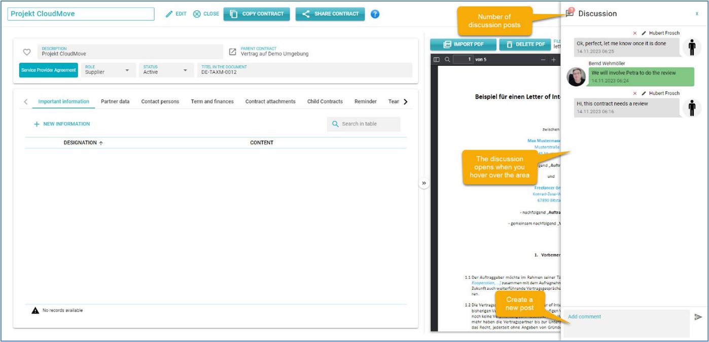 contractSILO allows you to have discussions about contracts. All users with access to a contract can follow and participate in the discussion. You can also choose the user you want to message by using the "@" icon.
