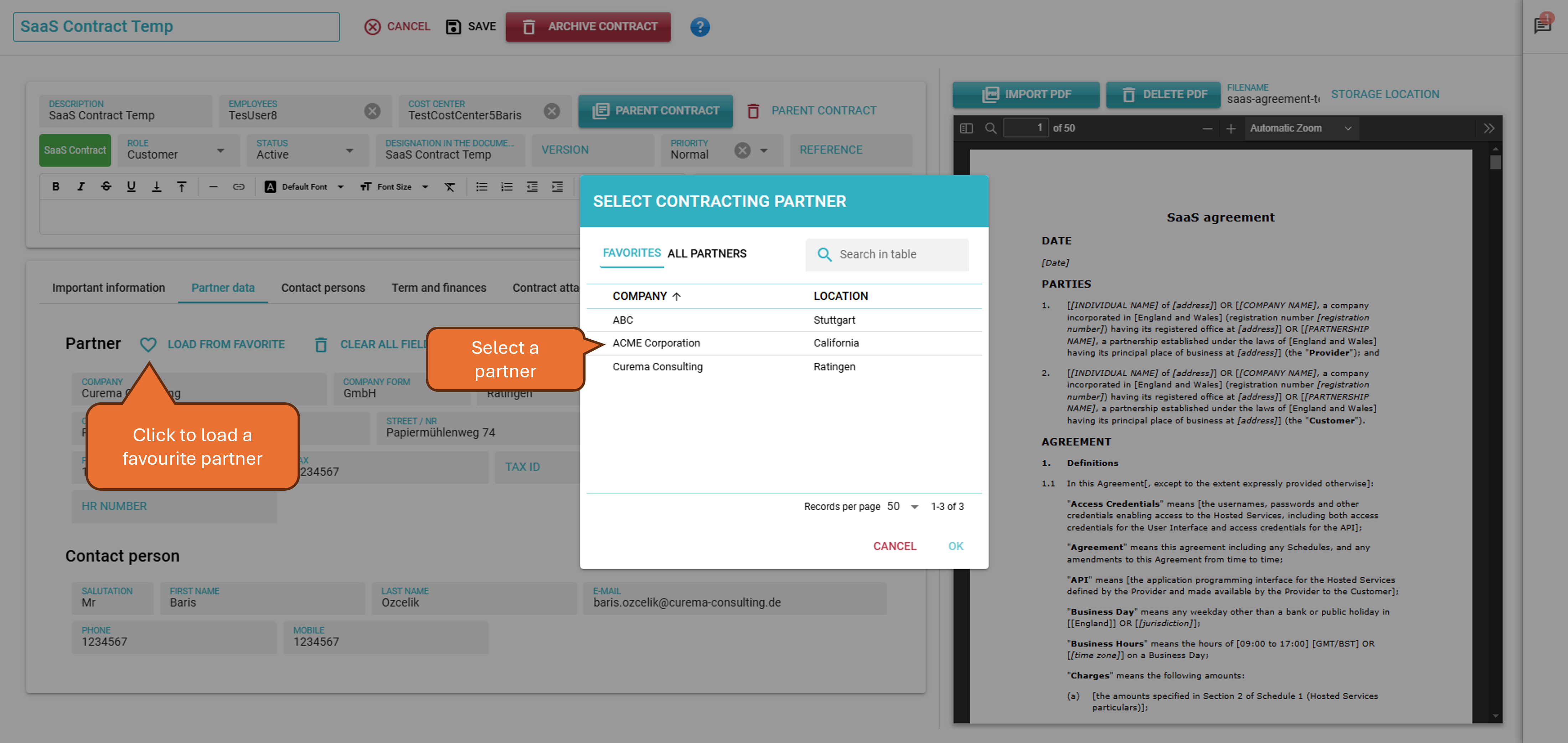 If you frequently enter your contracts with a specific partner, you can mark them as a favourite. To do this, open the detail view of a contract and switch to the Contract Partners tab. Click on the small heart next to the name of the contract partner.