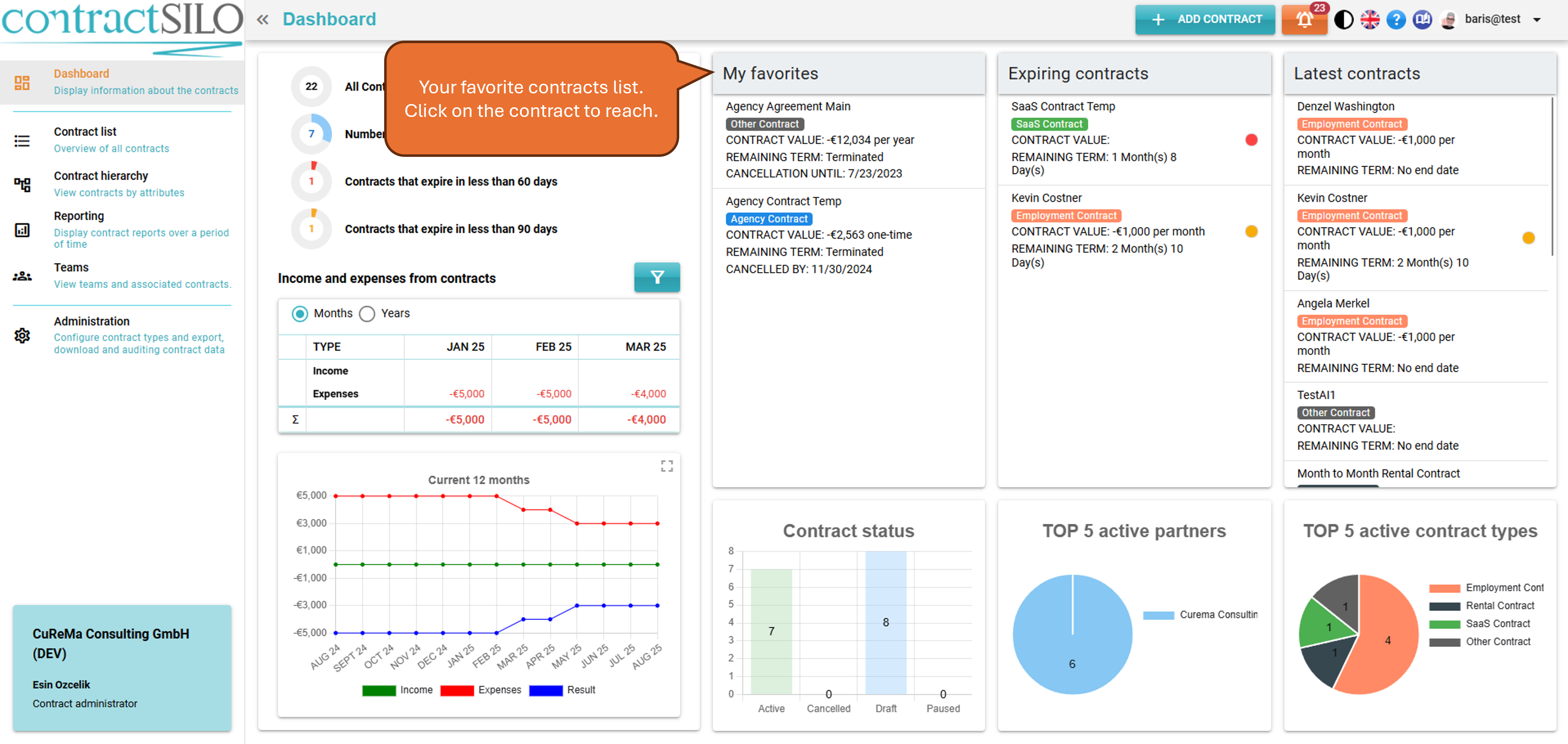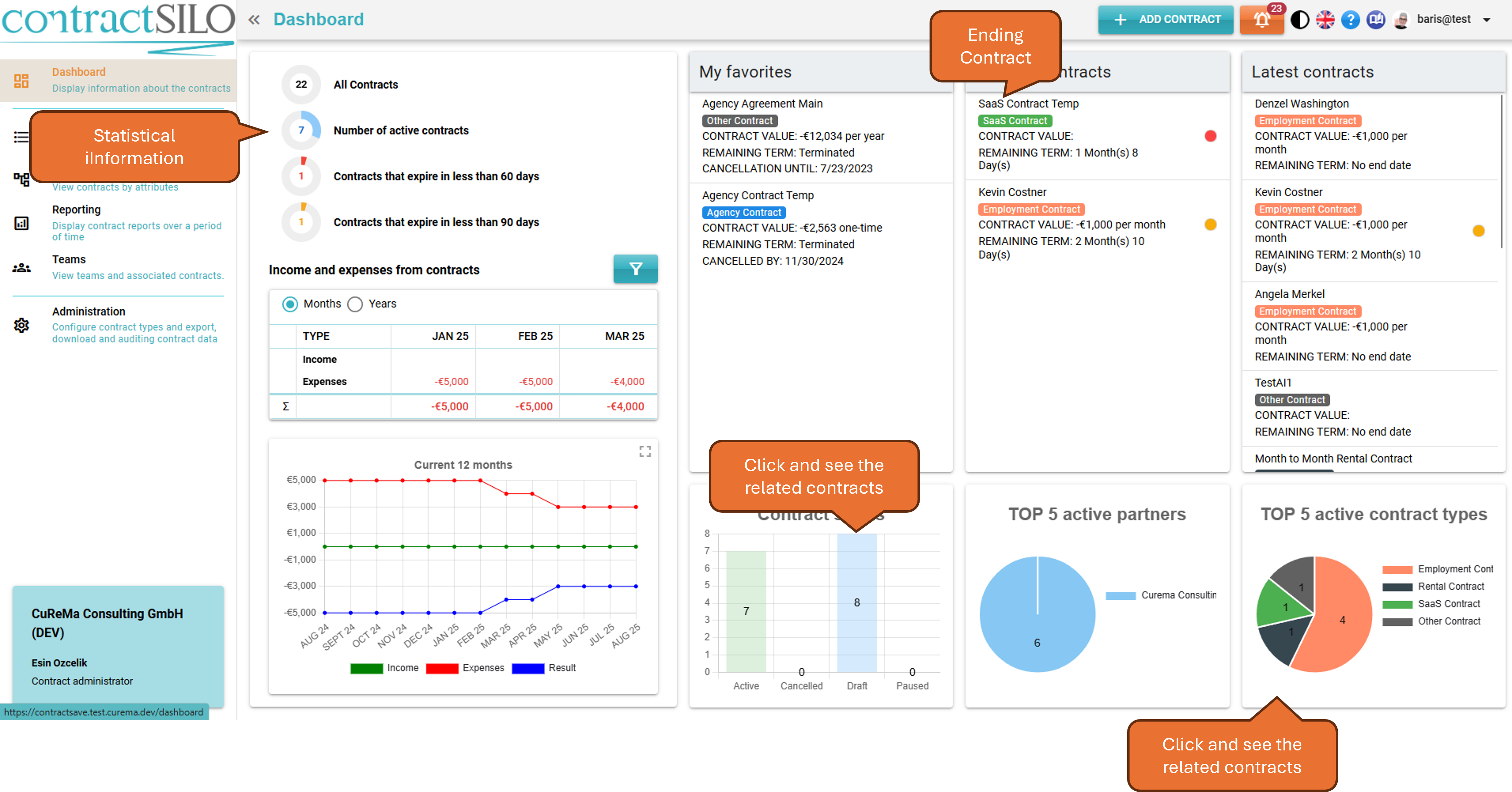 The Dashboard provides a quick overview of statistical data, income, and expenses associated with contracts. You can also use the Dashboard to quickly access specific contracts.