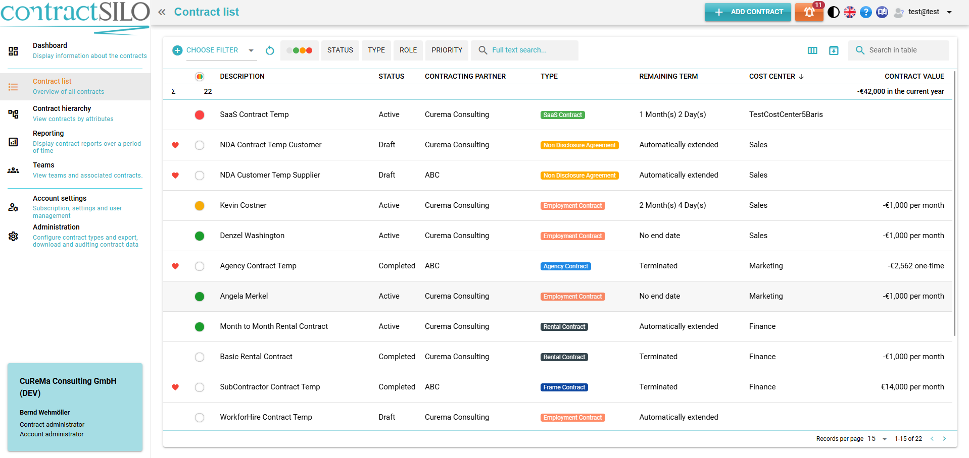 In this view, all contracts accessible to you are displayed. You can search and filter the list using various criteria. When a contract is clicked in the table, the details of the contract are shown.