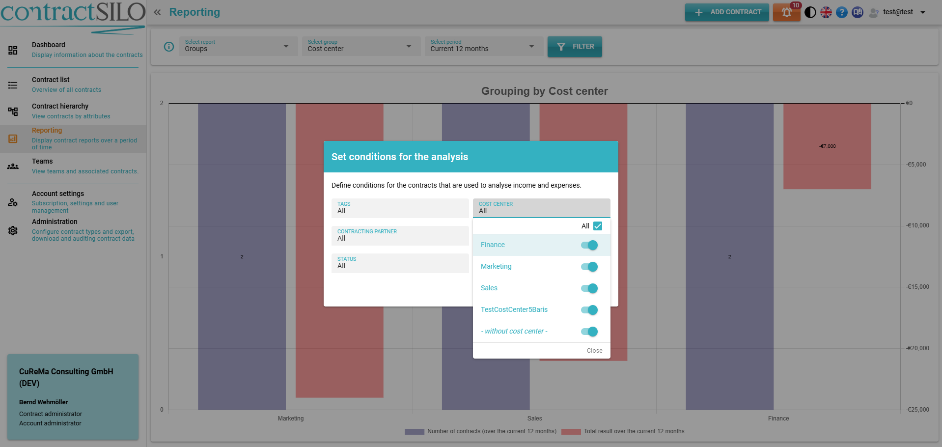 The Reporting menu provides graphical evaluations of contract data on various report topics. (Professional version only)